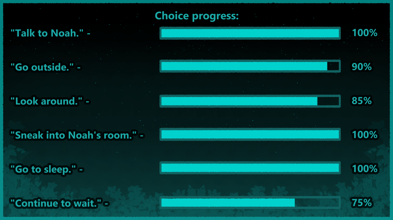 Here's the progress on the choices being updated. At first I had a good idea on what to do and I got pretty far with my ideas but unfortunately I hit a writers block during the middle of this month because there was a continuation issue that I just couldn't write around. There were also some interactions that happened way too early in Day 3 between the player(Y/N) and Noah that ended up creating 3 branching arcs that were too spoiler-y and too much for me to try handle. Eventually I got help from my play tester and we bounced off ideas and there was a happy solution in the end that I liked. Speaking of my play testers, in good news both of them were able to test out the new content and I got a lot of great feedback! :,D