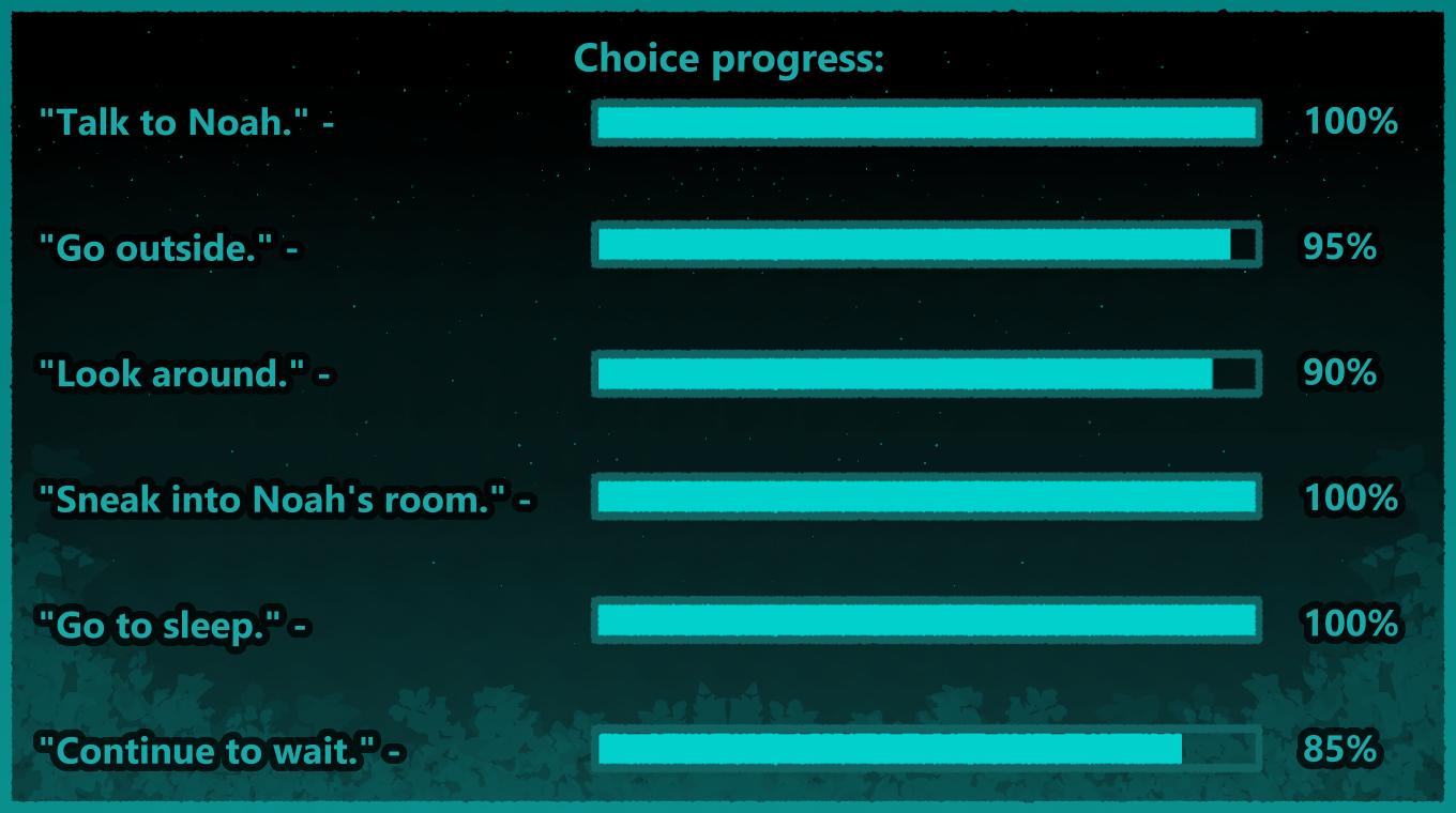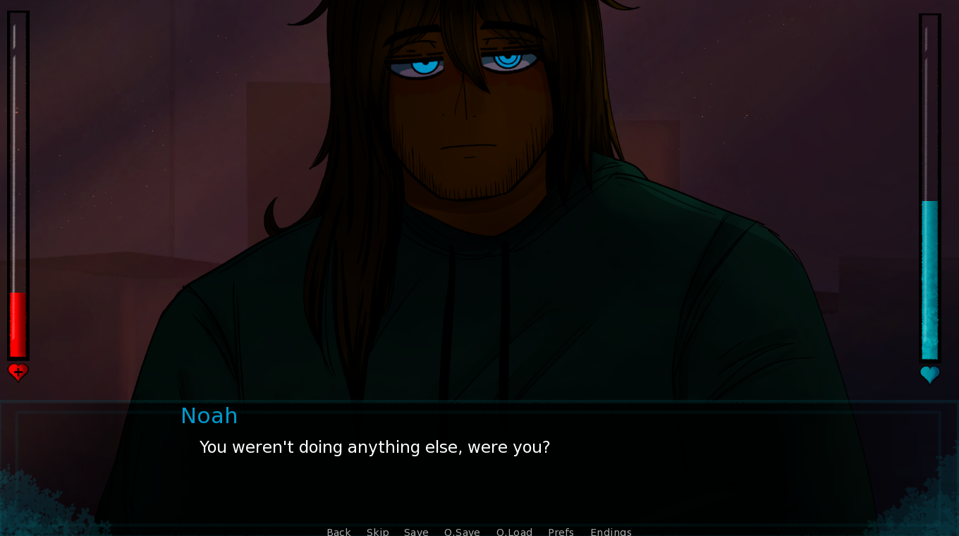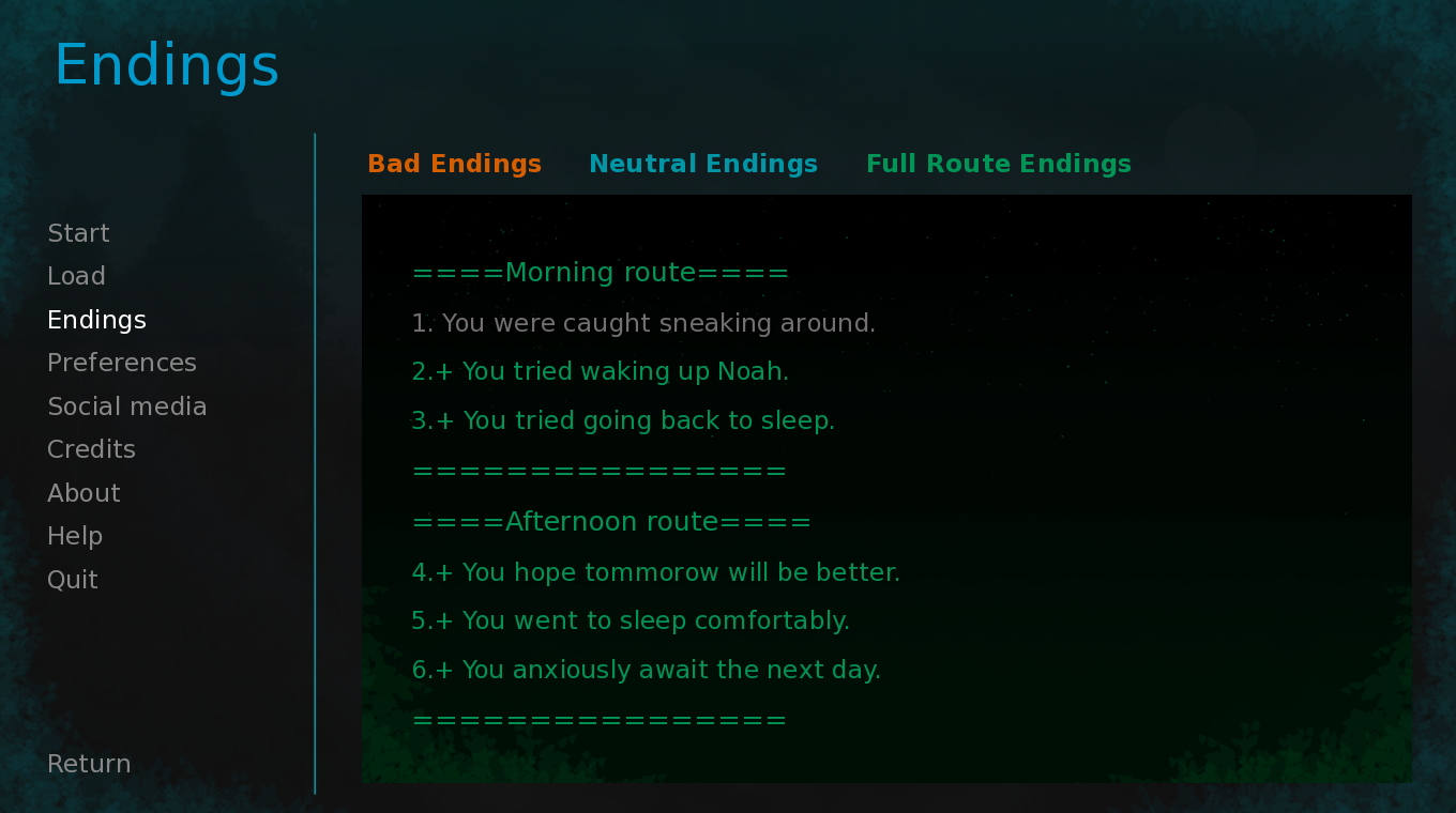 *To go a little bit deeper with this, the "Talk to Noah.", "Look around.", "Go to sleep.", and "Continue to wait." choices officially progress from the "To be continued" screen from the [Extended Demo] so I have to go and adjust the Endings collection. This also means the "Bad Ending's" being cleaned up too since I calmed down from adding so many. I also plan to do a Quality of Life fix to this too but that'll be in the future once I'm 100% certain this is what I want! :]
